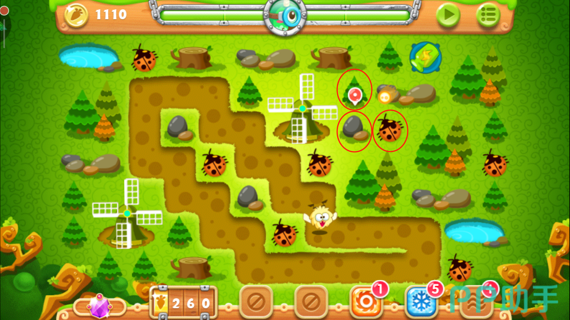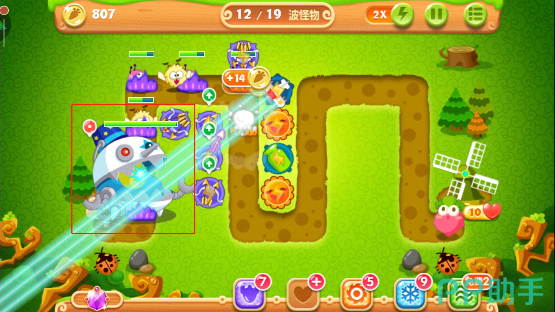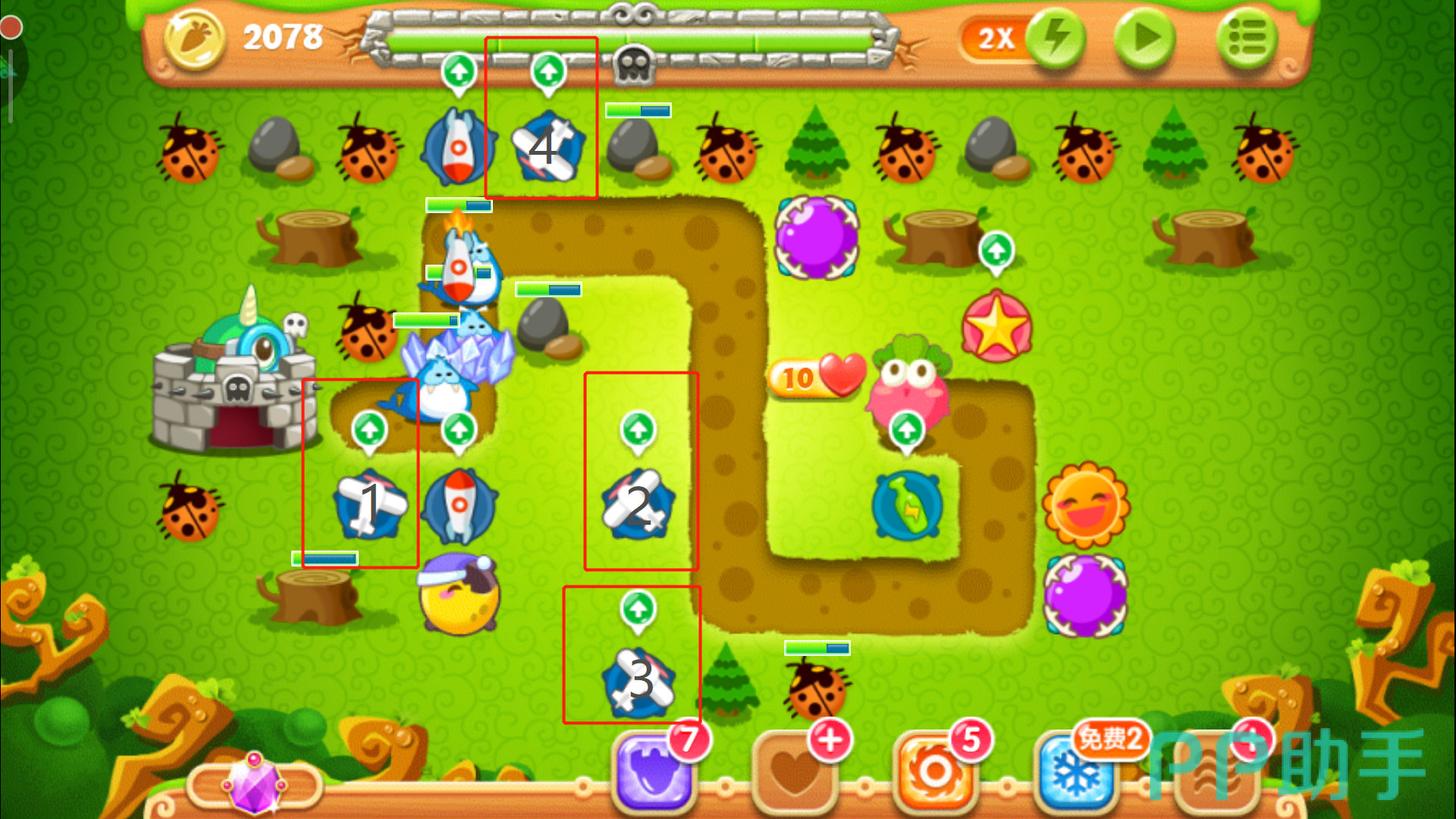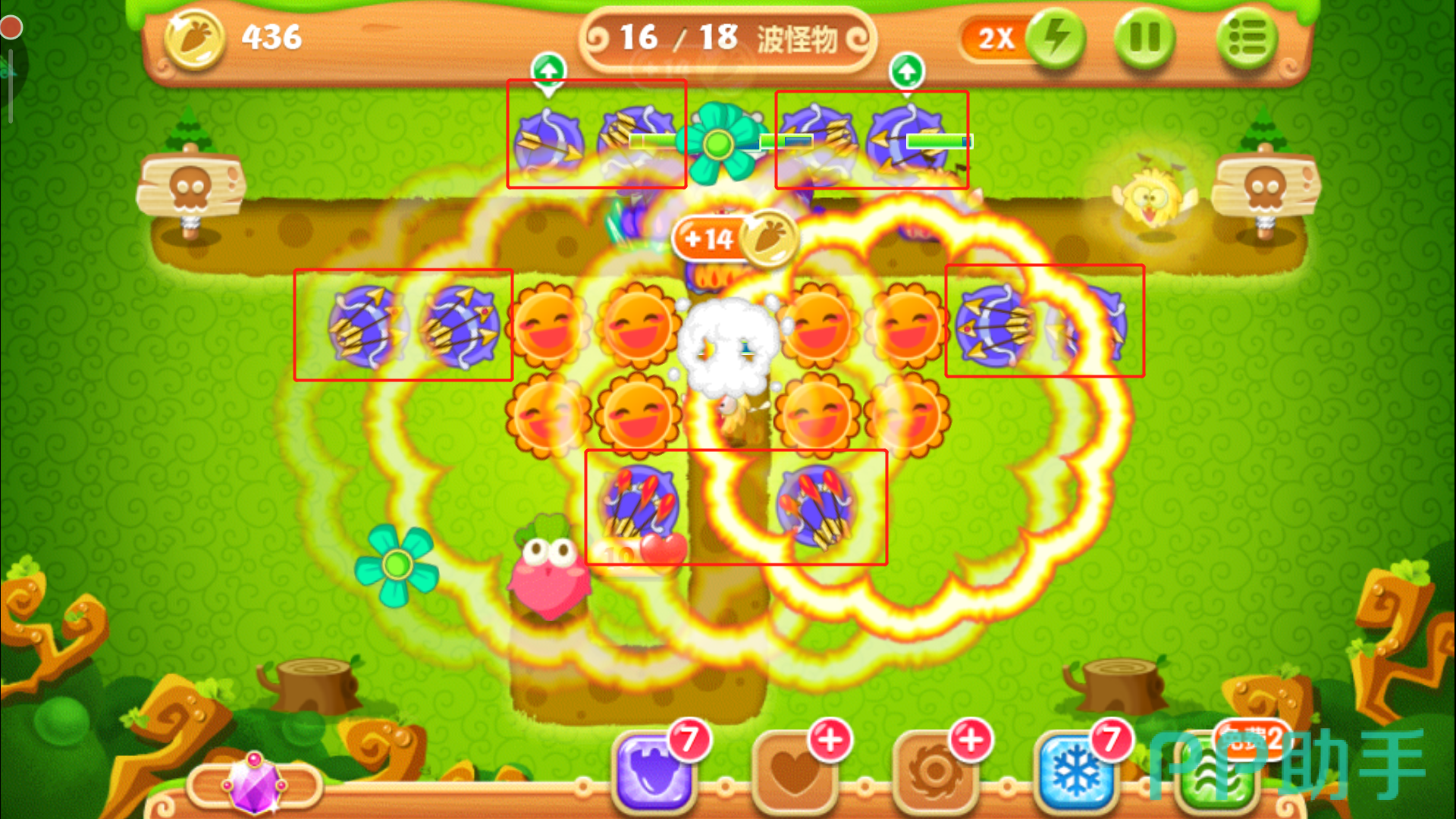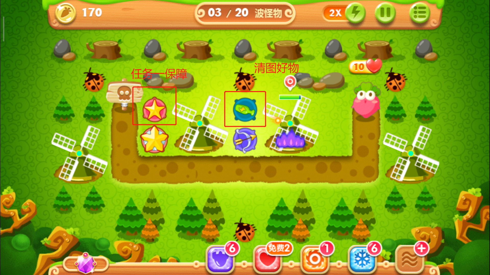 这里一定要把控好时机别玩脱了,否则萝卜被咬就拿不到金牌了。其实在正常情况下,怪物们抵达下路之前松树就会被清除掉,紧接着在左上角空地的位置放下一个多重箭,等这波怪物被消灭后,立刻攻击萝卜上方的障碍物,打破之后我们得到一个瓶子炮。