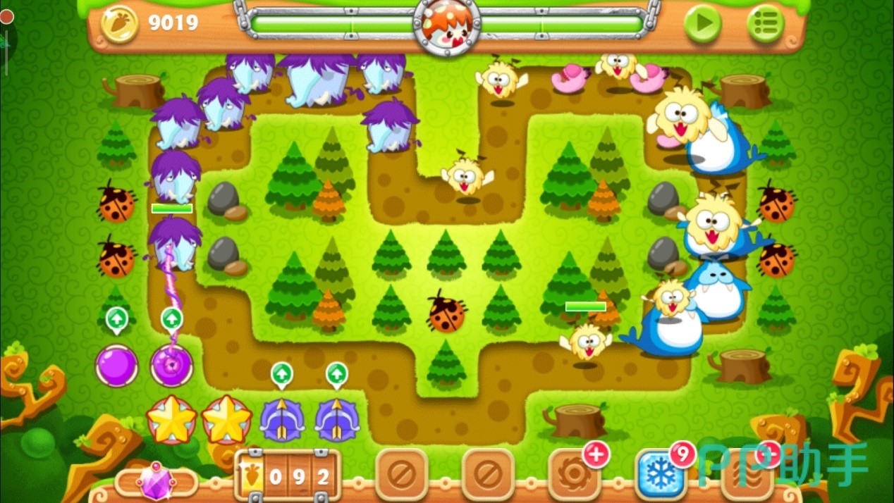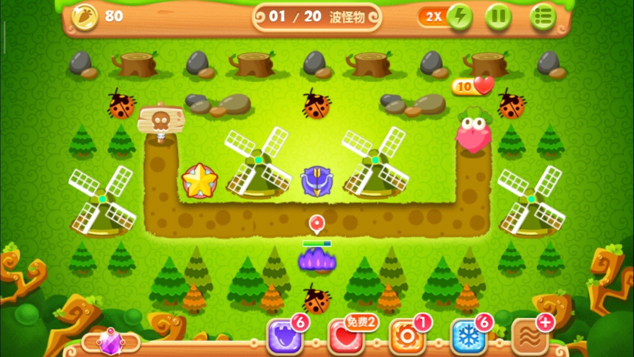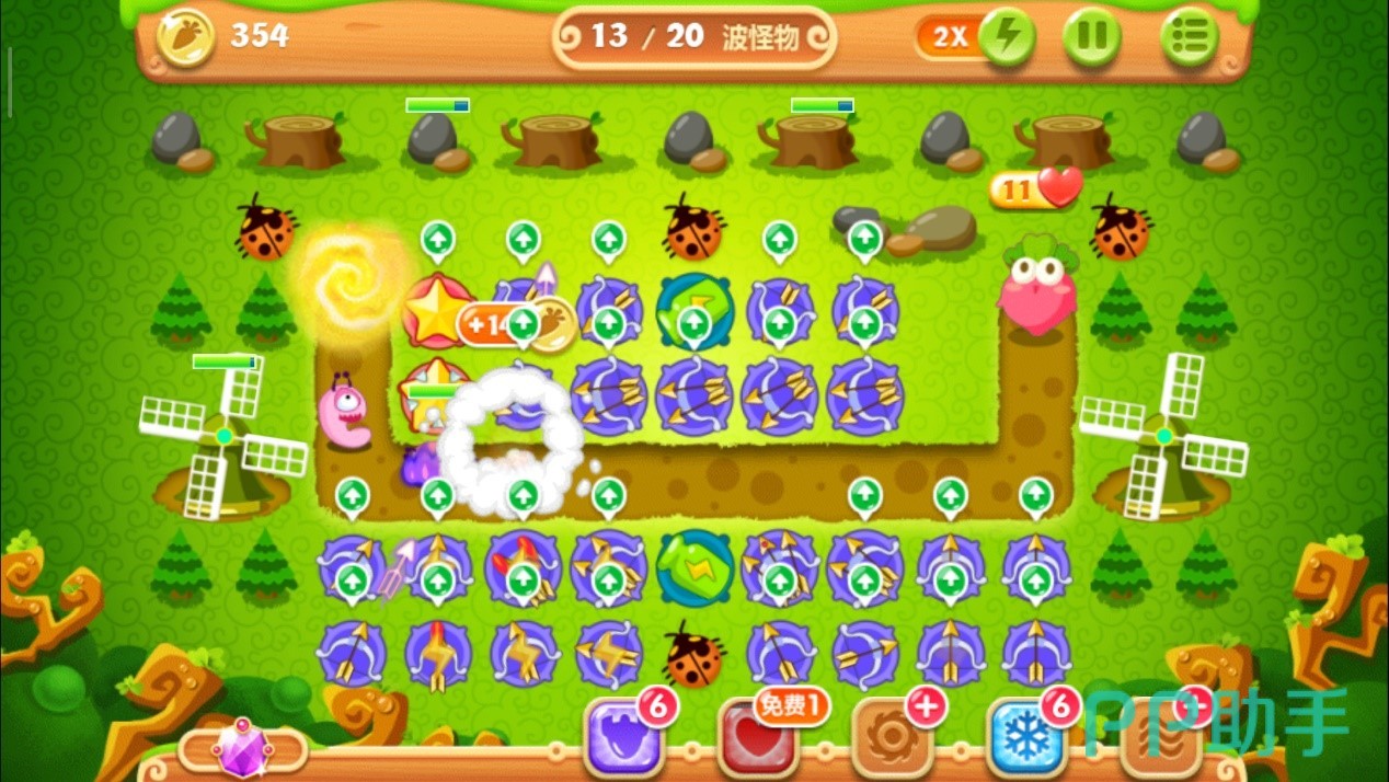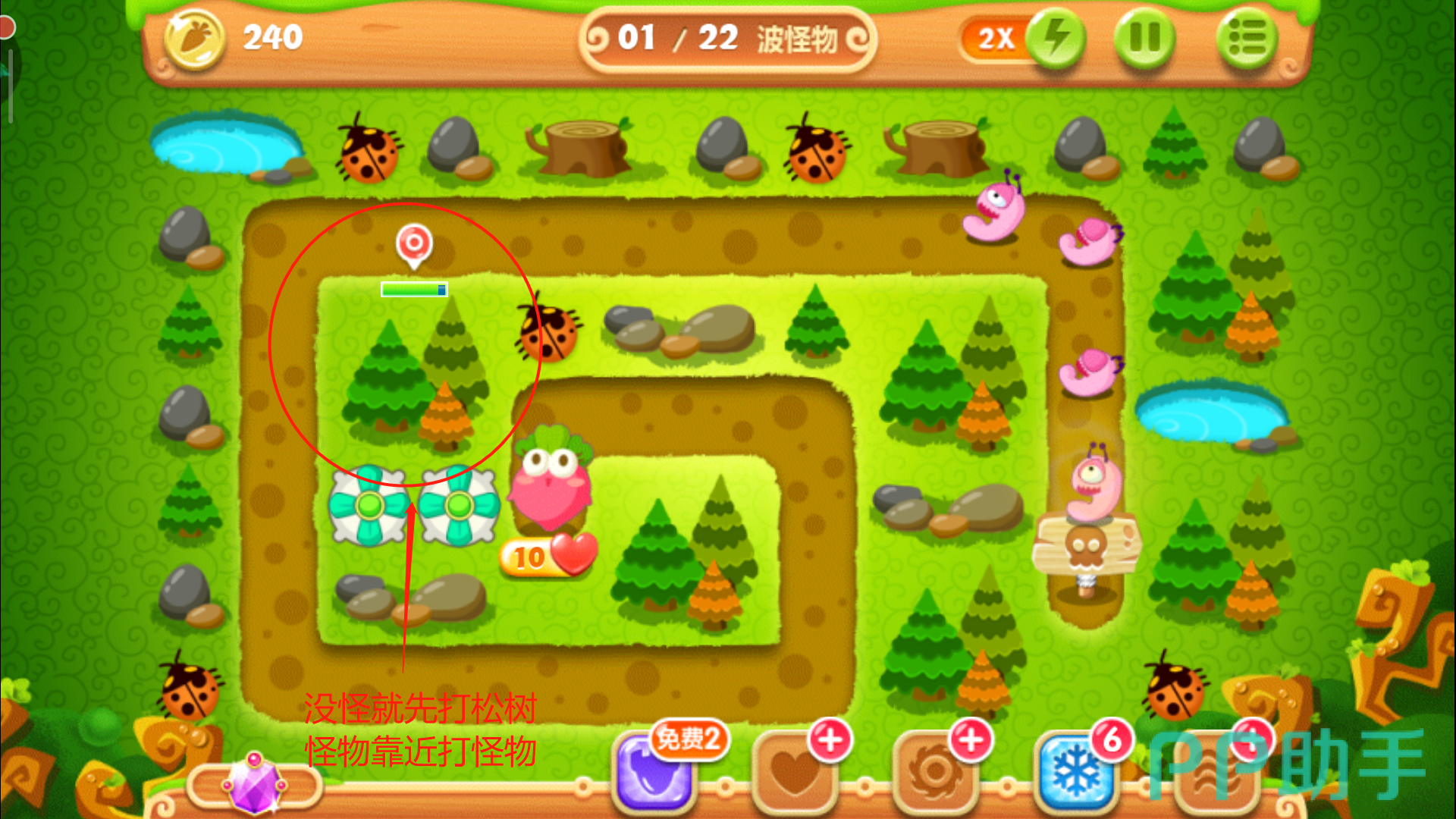 注意怪物们的位置,到达下面时马上停止攻击松树,减速风扇会立刻清掉这波血量极低的小怪物。这波过后用得到的金币升级其中一个减速风扇至满级,继续攻击上面的松树,对于怪物还是用方才的套路,靠近时将其消灭。