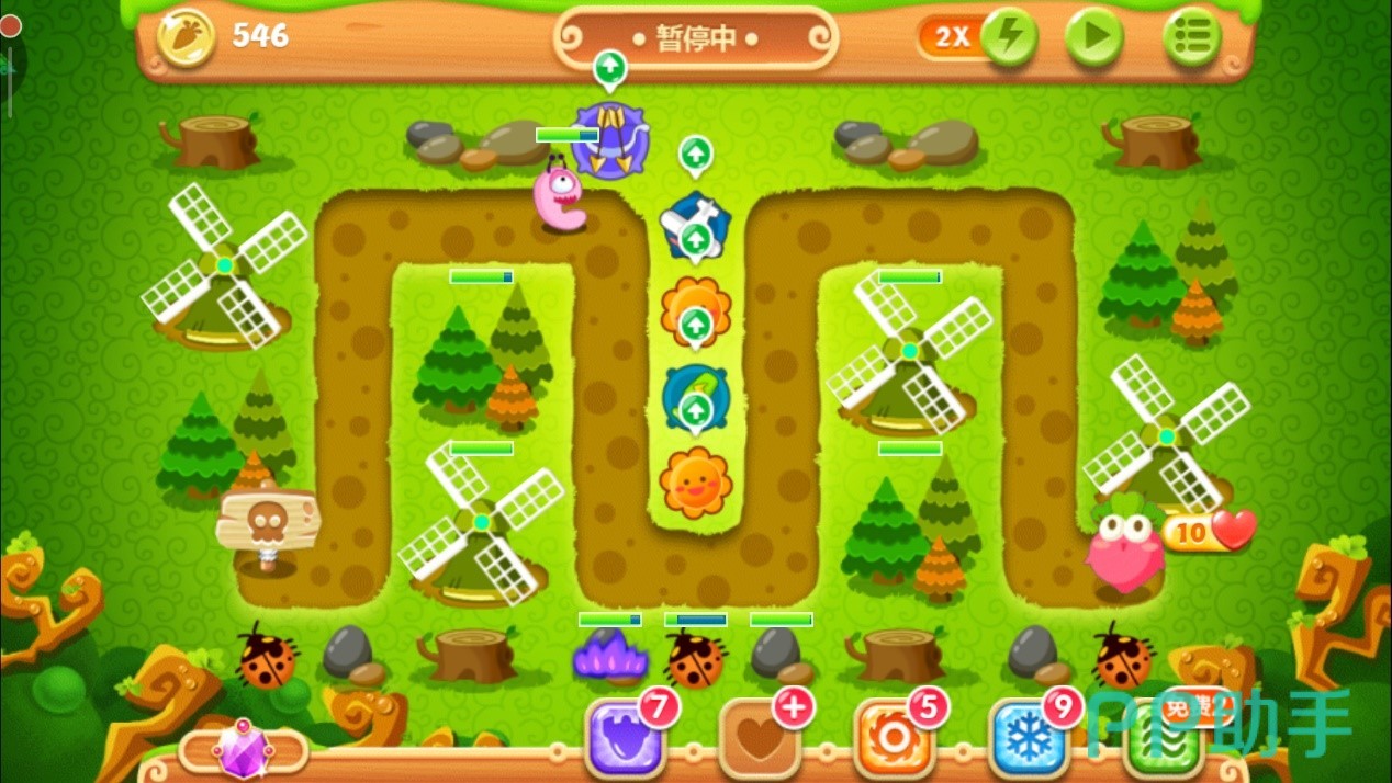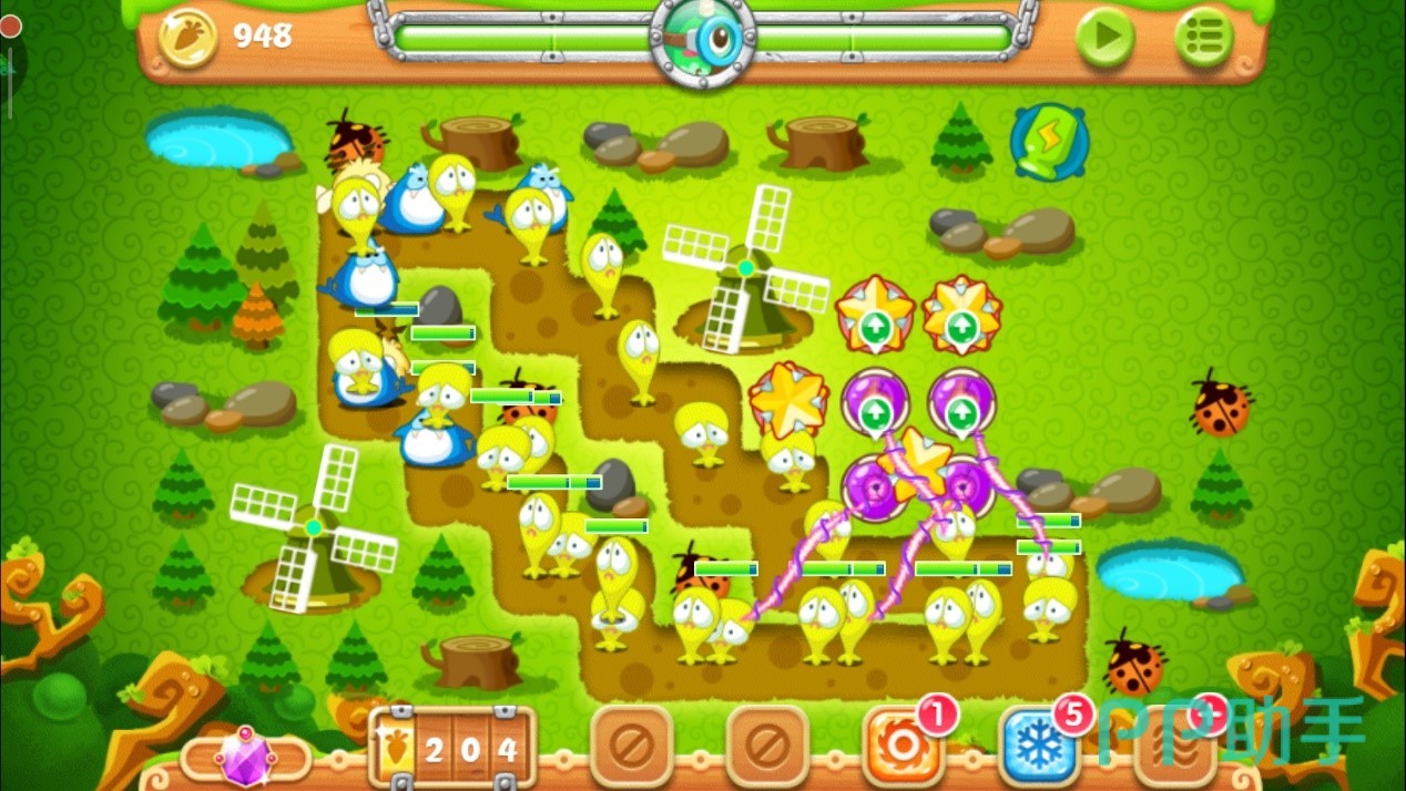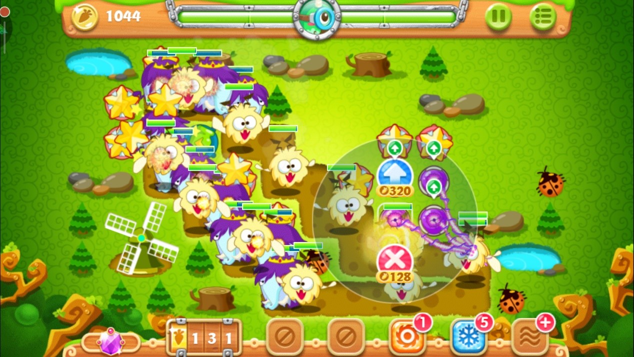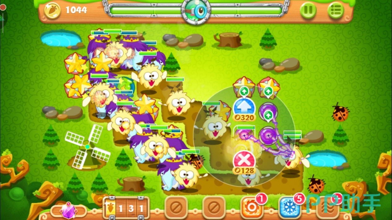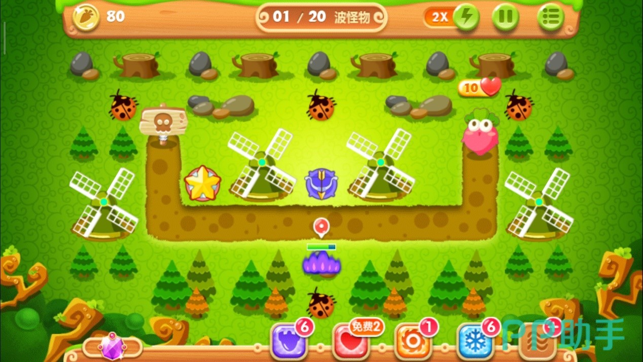 注意怪物们的位置,到达下面时马上停止攻击松树,减速风扇会立刻清掉这波血量极低的小怪物。这波过后用得到的金币升级其中一个减速风扇至满级,继续攻击上面的松树,对于怪物还是用方才的套路,靠近时将其消灭。