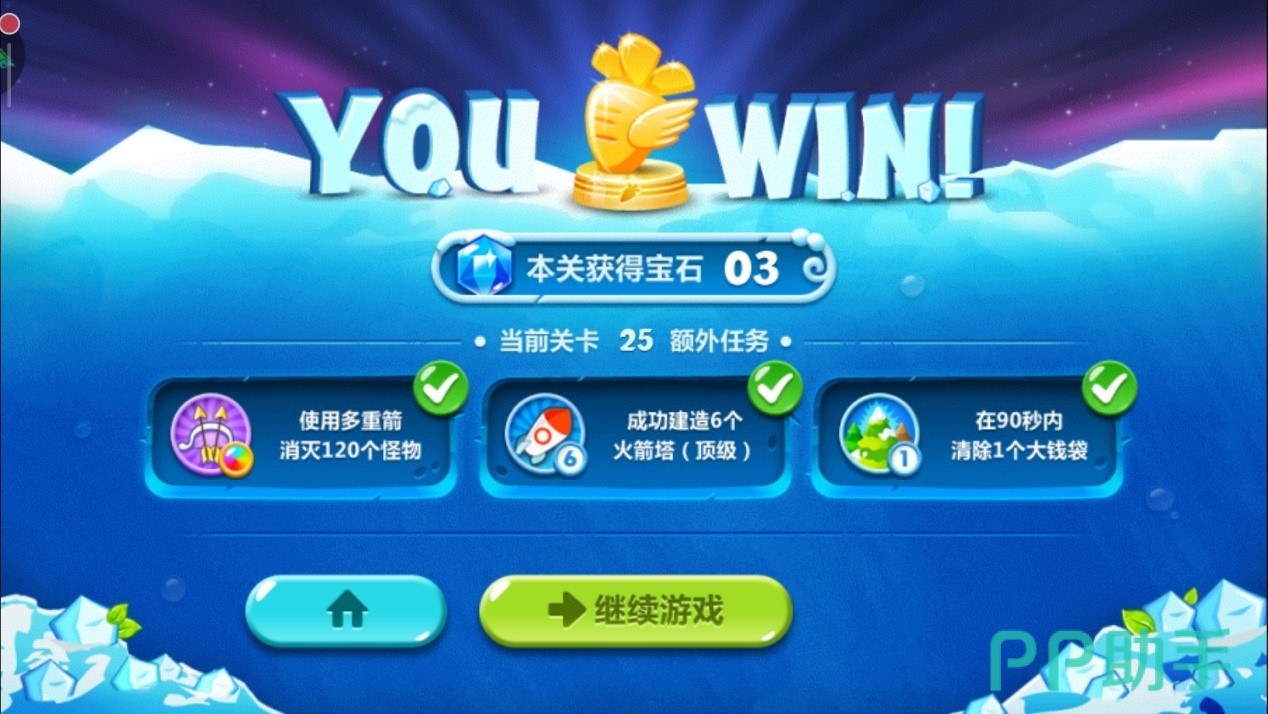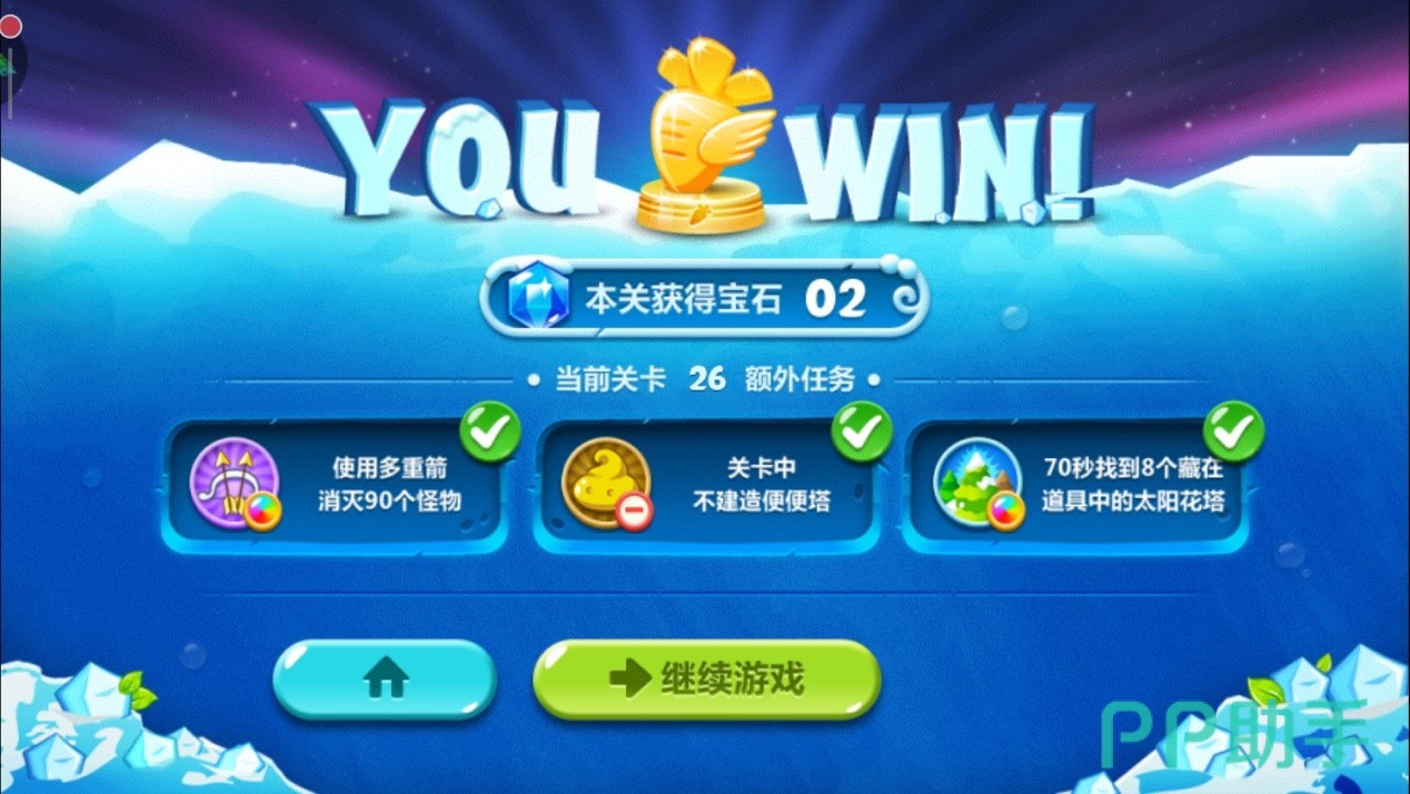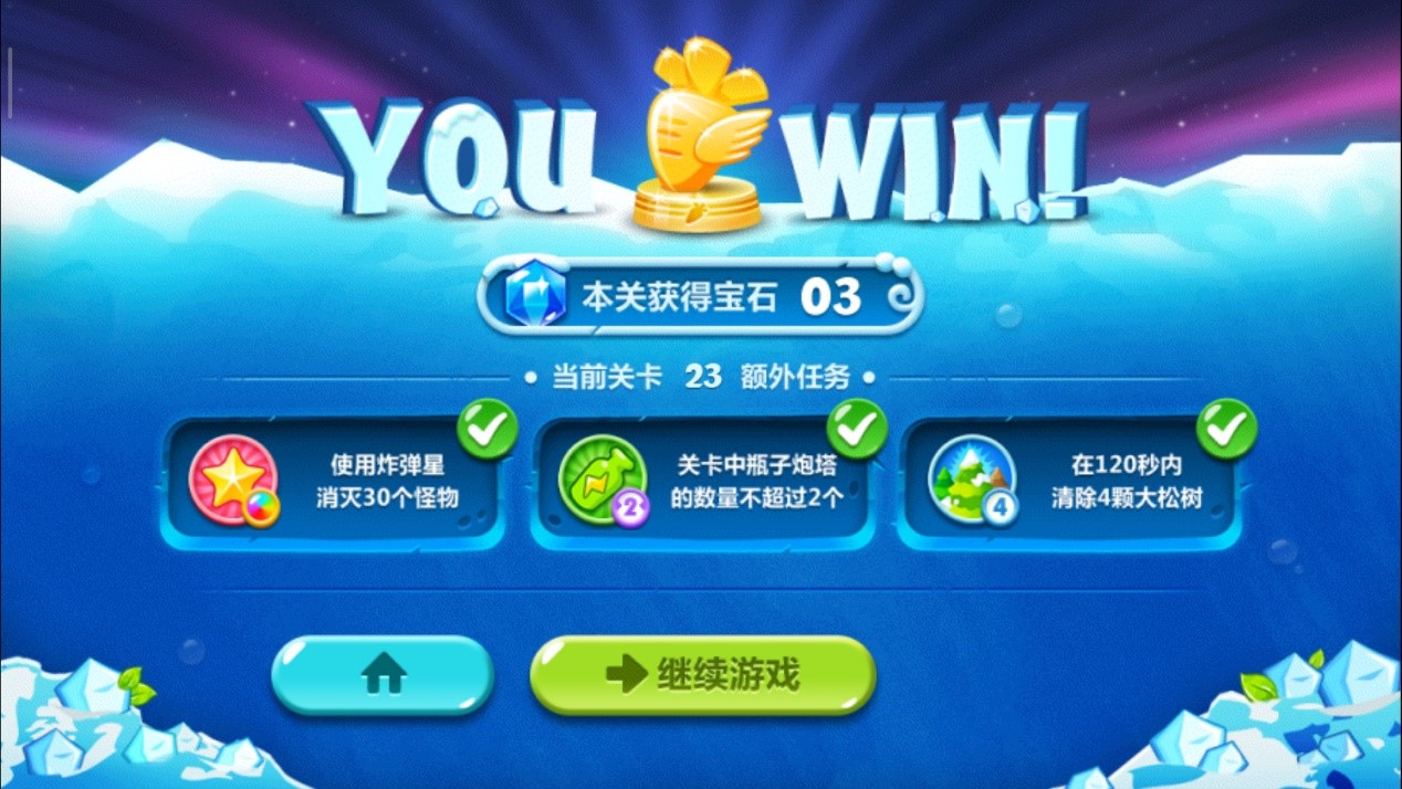 最后眼睁睁看着炮塔们消灭蘑菇怪,成功通关,三星外加金萝卜get。