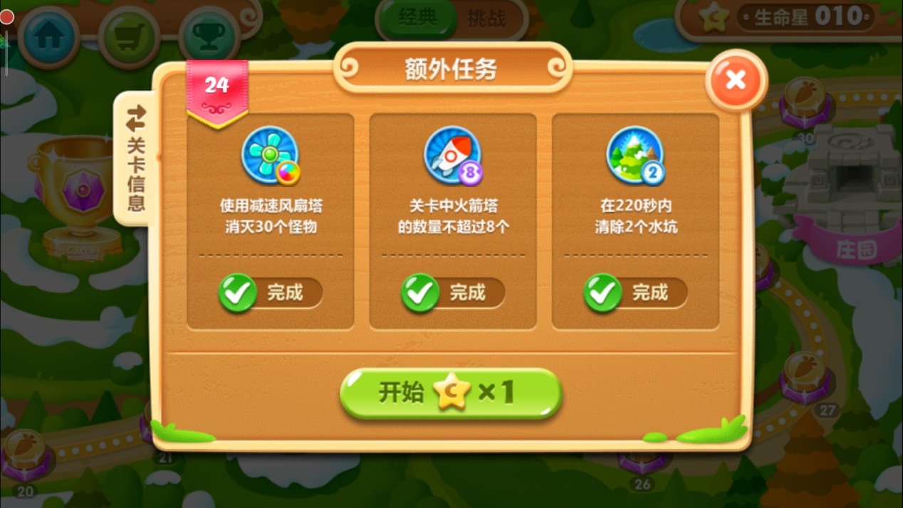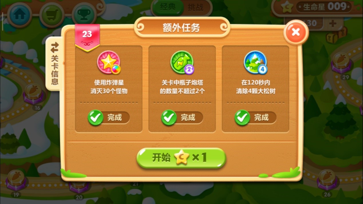 首先我们要知道的是,这关的炮塔只有三种:瓶子炮、便便塔以及炸弹星。想要拿到三星,需要完成以下几个任务:使用炸弹星消灭30个怪物,瓶子炮的数量不超一个,并且要在180秒内清除4颗大松树。