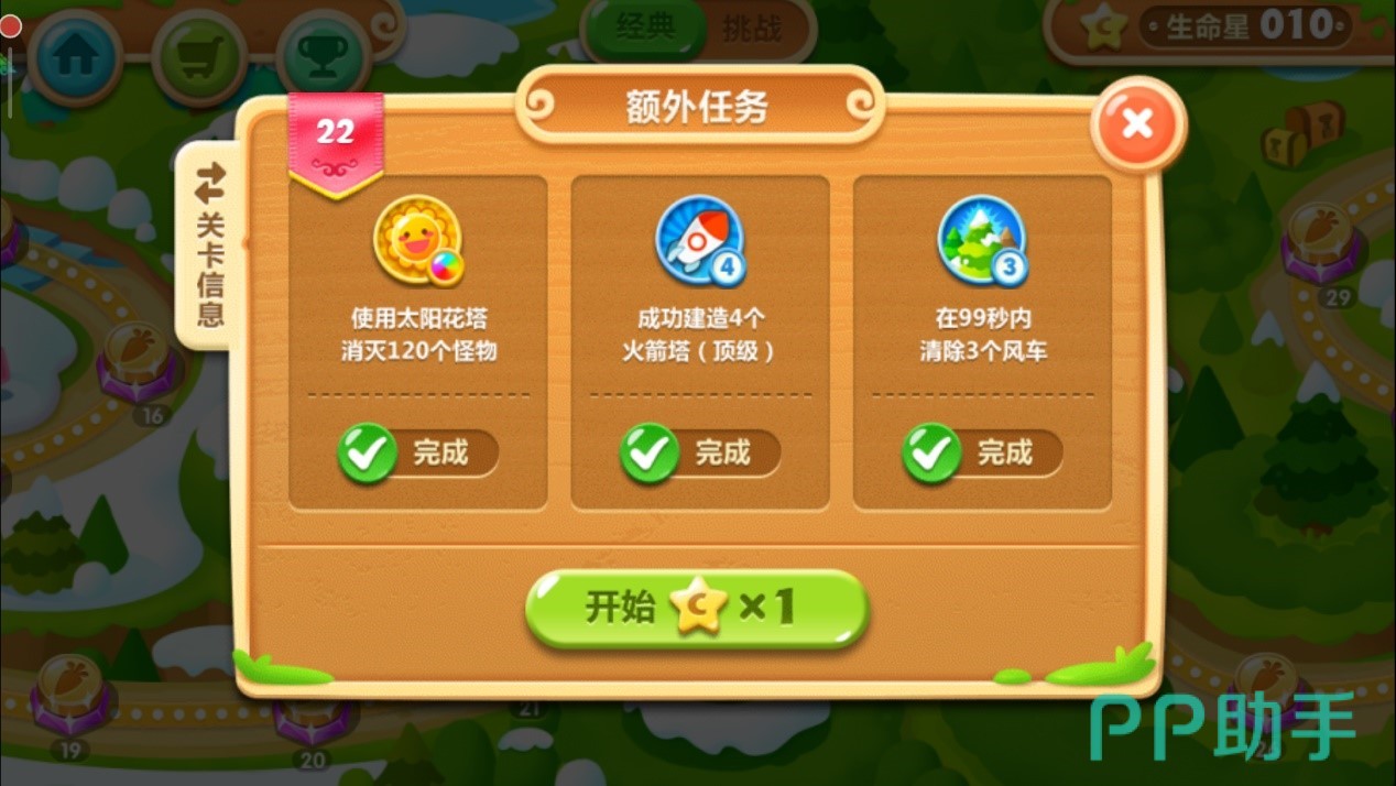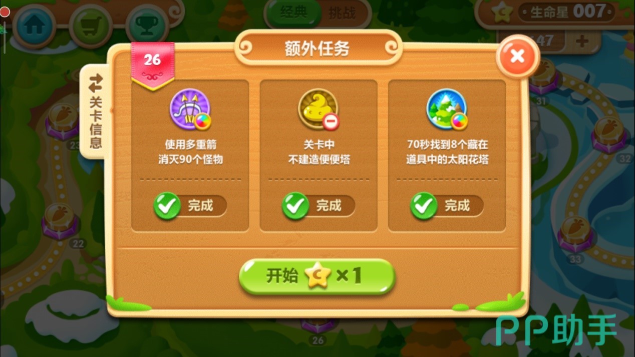 这关和前面几关一样,只有便便塔、魔法球以及多重箭三种炮台。而想要得到奖杯,又要完成三个不同种类的额外任务:使用多重箭消灭90个怪物、关卡中不造便便塔以及在70秒内找到8个藏在道具中的太阳花。