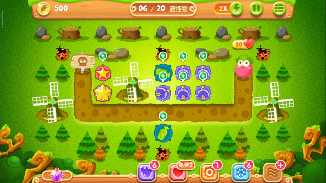 先在萝卜右上角放下一个多重箭并升到二级,马上开始攻击上面的大松树,注意怪物靠近时停止攻击,先清怪为主。很快钱就够了,直接把多重箭升到三级。