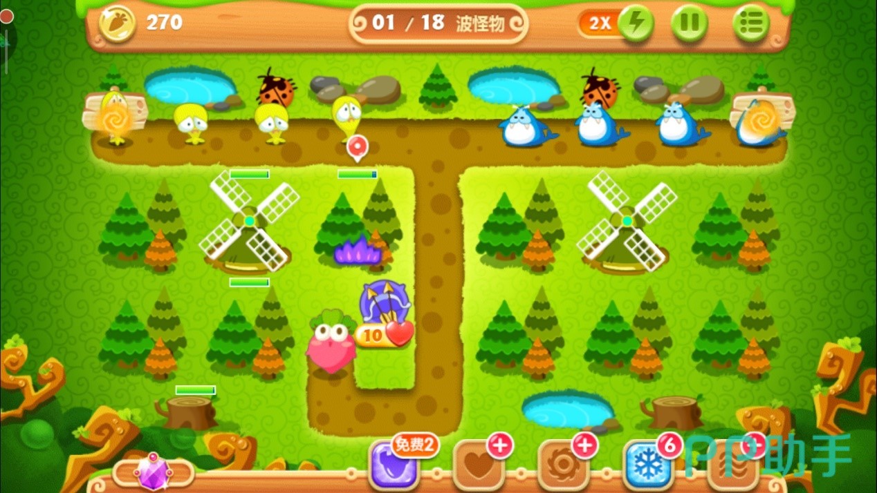 为了完成任务一,我们在萝卜左侧放下两个减速风扇并升到二级,开局就让它们攻击上面的大松树。