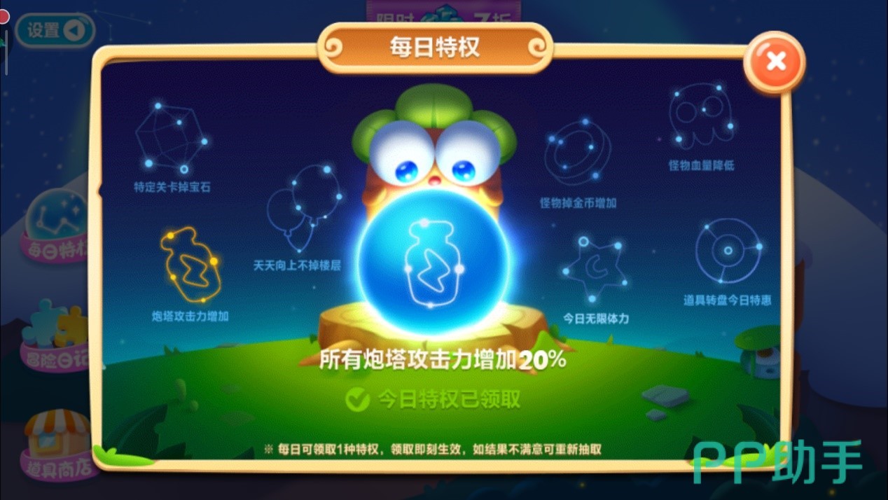 记得把每日的免费特权领取了哦,小编今天非常幸运的得到了炮台威力增益buff!