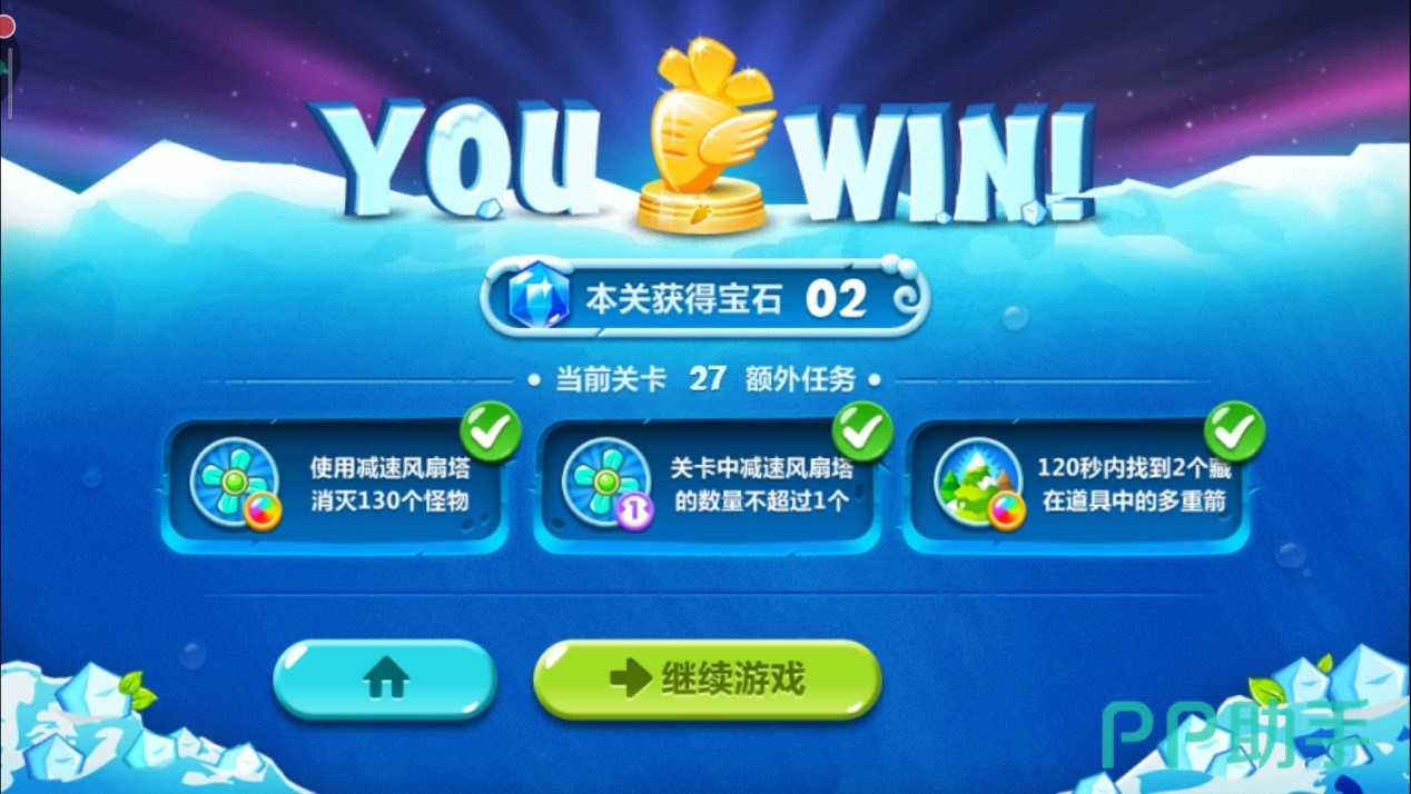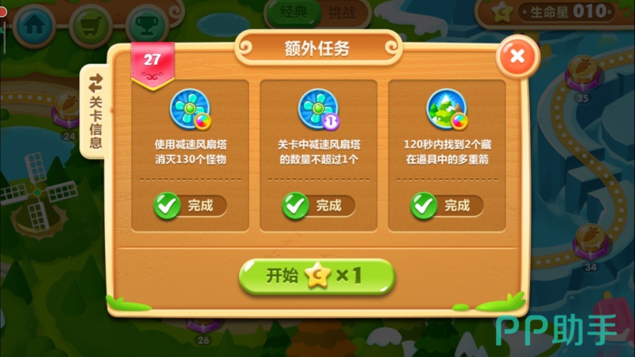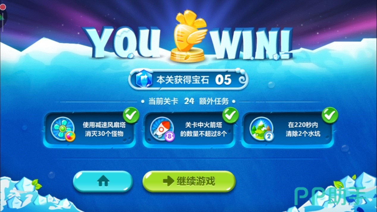 中途金币足够的情况下把这个减速风扇升到满级,一切正常下,水坑会在规定的时间内被清除掉,任务三达成。此时此刻减速风扇也已经消灭了足够的30只怪物,任务一达成。