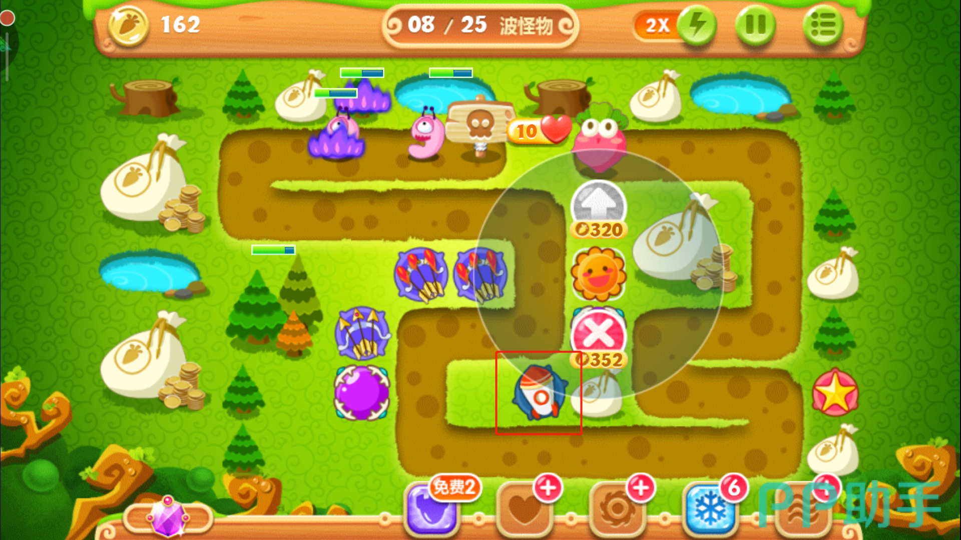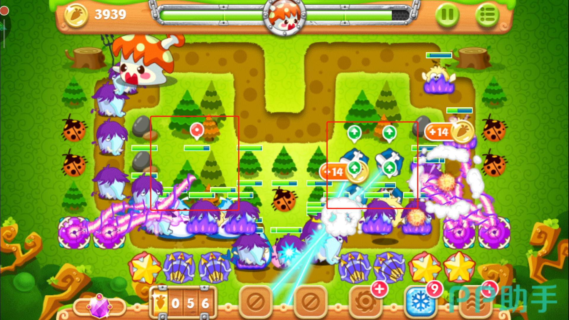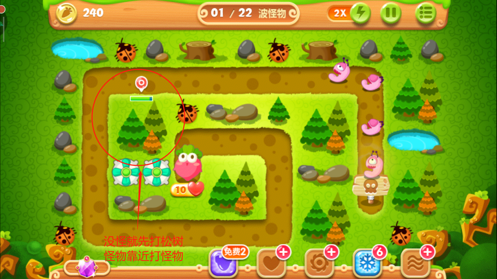 正常情况下这个时候金币充足,直接将右侧瓶子炮升到满级,开始清理右面的大松树,怪物就交给后面的炮台即可。