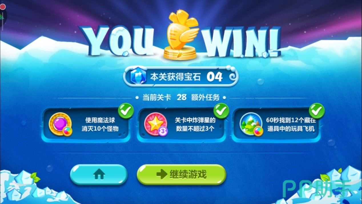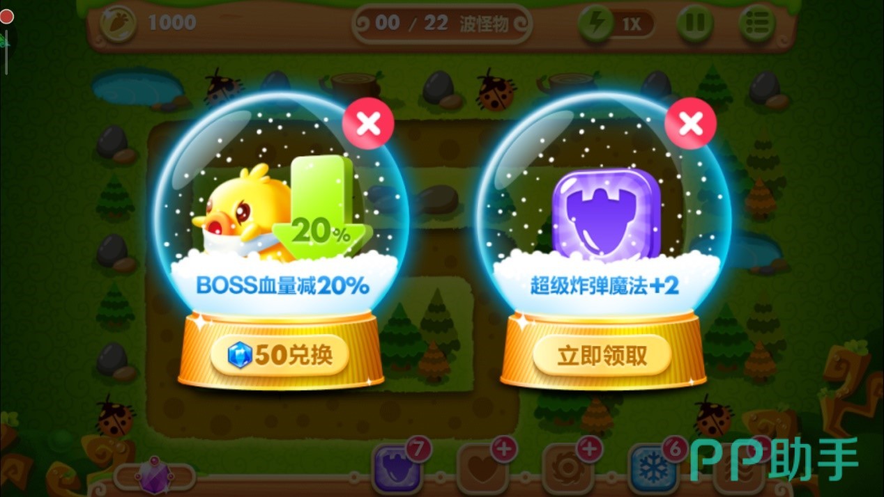 只要你不手抖点到瓶子炮,第二任务也妥妥的搞定,接下来我们用得到的钱将右侧的四个魔法球升到满级,这玩意对付boss能够打出大量伤害。接下来只需要用得到的金币不断补充炸弹星,磨光boss的血量并清掉全部小怪后,成功通关!