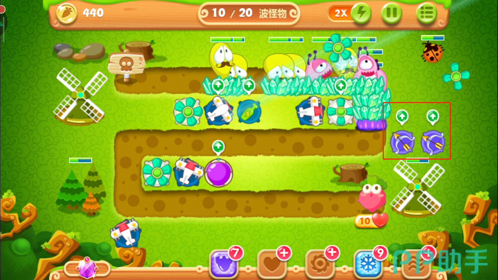 接下来我们升级中间的多重箭,在怪物刷新的空隙中,及时清理地图中间的两个大风车,这里建议在多重箭上方建造一个瓶子炮并升至满级,清图神器了解一下。