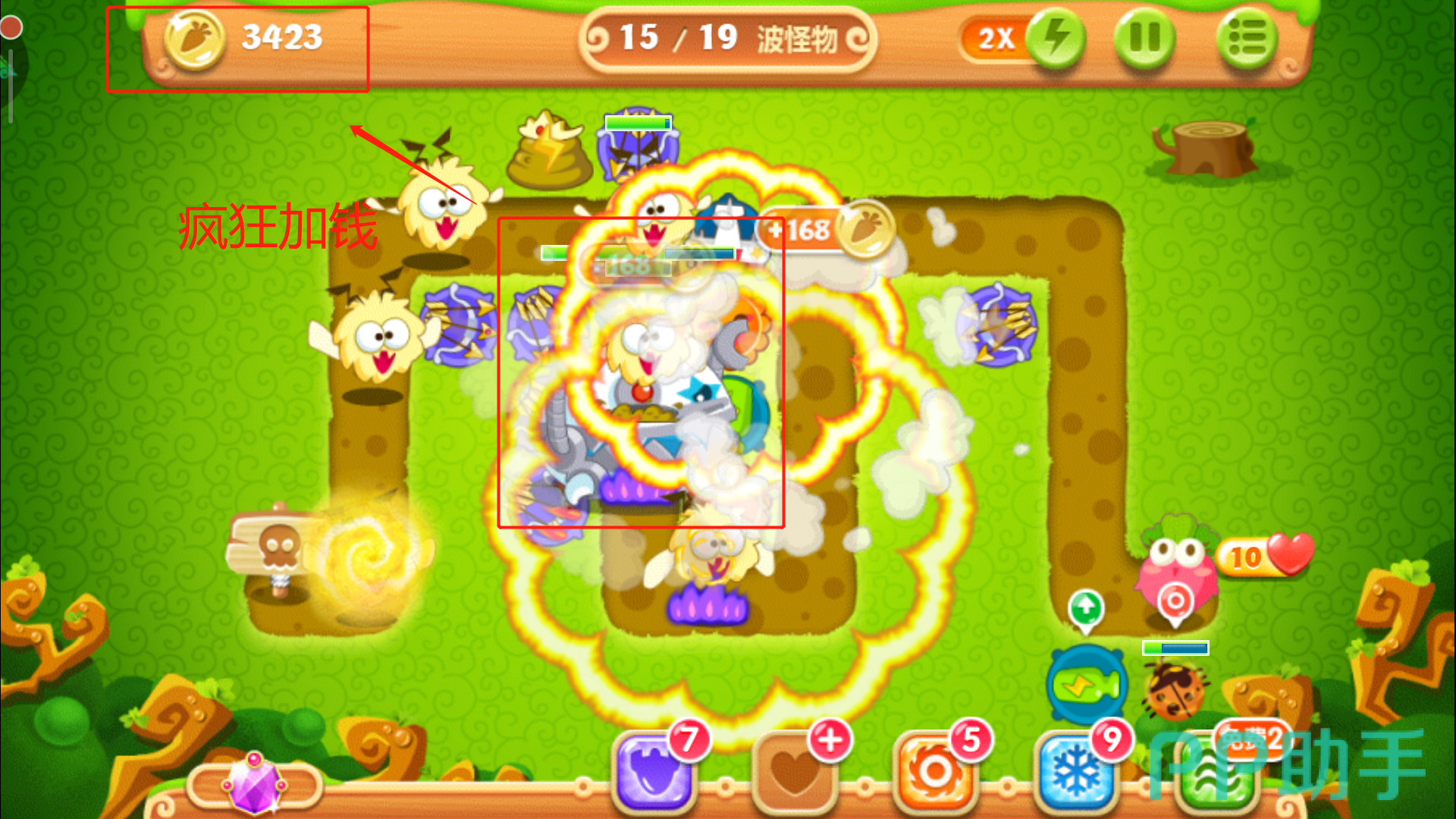小编这波得到的是一个多重箭和一个炸弹星,那么用剩下的400金币将多重箭升到二级,在怪物进入多重箭射程内之前,先操控它攻击下面的大钱袋。