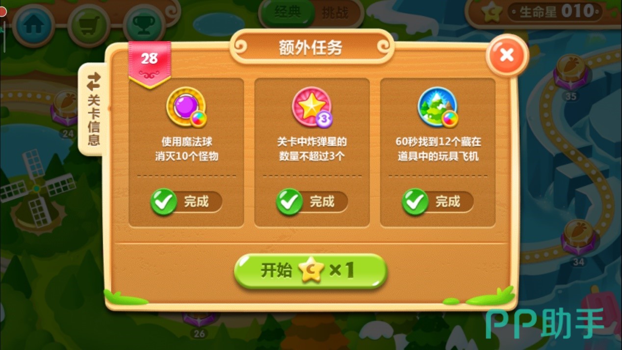 开局如下图,一个魔法球一个炸弹星,分别升一级,炸弹星完成任务,魔法球清理标记的道具。