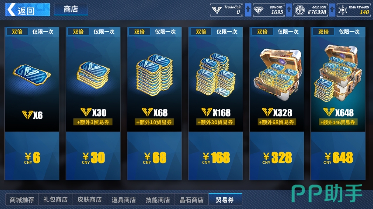 首先,点开在游戏主界面的商店选项,如上图所示,我们能在界面右上角看到玩家当前的贸易券数量。需要说明的是,贸易券是游戏中的少数付费道具之一,用它可以获得各类稀有的物品。
