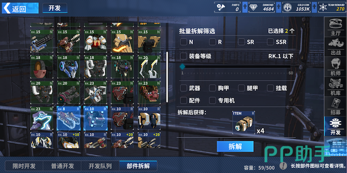 普通玩家初始拥有5个开发队列,即可同时开发5个机甲部件,剩下的队列需要额外消耗晶石来解锁。小编在这里建议玩家最好在下次开发必定出SR级部件时使用武器设计图,否则因为平常开发出SR级部件概率只有2.5%,容易导致浪费设计图。