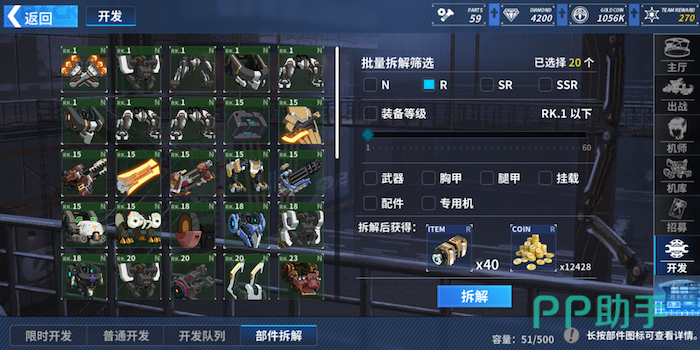 部件开发可以获得N~SR机甲部件,当然部件越稀有,出现概率越低。普通开发一次需要消耗10个机械零件,高级开发则需要消耗20个机械零件。