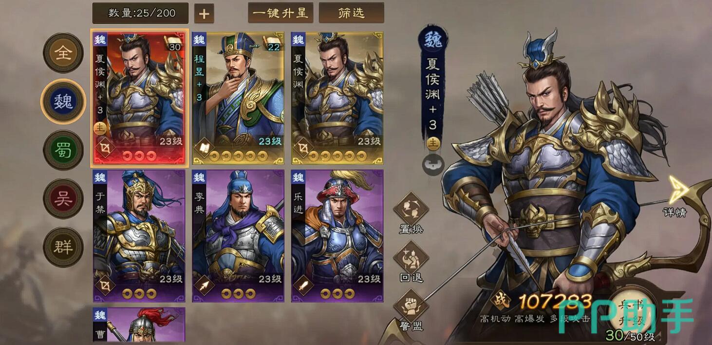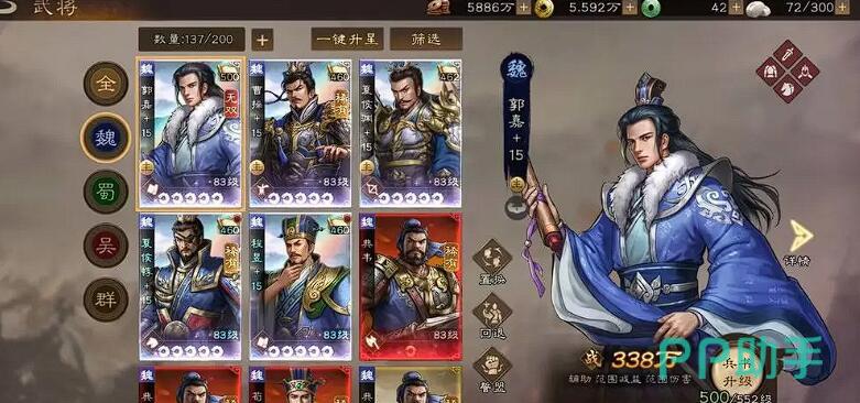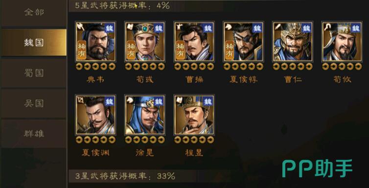 接下来分析一下四方势力的武将情况,首先是魏国武将,在魏国阵营中,有不少值得培养的武将,夏侯渊就是其中之一,他在游戏中的表现十分出色,还有夏侯惇,对于0氪玩家来说,主养神将单点理论上是最强的选择,荀彧则是魏国中后期的大法师,拥有强大的法术输出能力,在团队战斗中能够发挥重要作用,典韦呢前期不太适合培养,因为他的优势在后期竞技场才会显现出来,后期的典韦在竞技场上是猛将一枚,在前期拉夏侯渊星级的时候,如果魏国池子出现了非稀有的金卡,比如曹仁、徐晃、荀攸等,都可以统统当作狗粮吃掉,以便集中资源提升核心武将的实力。