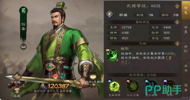 刘备的天赋具备一次性增伤的效果,而且在游戏中后期开启大招之后,还能够持续为队友提供增伤支持,除此之外他还能无条件提升群体队友的爆伤属性,其技能还可以在大范围内为队友增加幸运值和暴击率,可以说如果关羽是蜀国阵营的输出核心,那么刘备就是当之无愧的辅助核心,对于小氪玩家而言,由于资源相对有限,所以在前期并不建议对赵云进行培养。