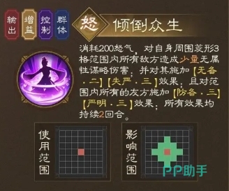 当貂蝉在战斗中积攒足够的怒气之后,便可释放出威力强大的怒气技能倾倒众生,此技能需要消耗200怒气值,一旦释放将会以貂蝉自身为中心,对其周围菱形2格范围内所有的敌方目标造成高达 80%无属性谋略伤害,然而倾倒众生技能的恐怖之处还远不止于此,它还会附带两种极为强力的减益效果无备和失严,同时作用于敌方,无备效果会使敌方的兵刃减免降低 30%,而失严效果则会让敌方的谋略减免降低 30%,使得敌方在应对我方的谋略攻击时也陷入了极大的困境,这两种减益效果均会持续 2 回合之久,此时大家就可以趁机对敌方展开猛烈的进攻态势,利用敌方防御薄弱的时机,发动全方位、多层次的攻击。