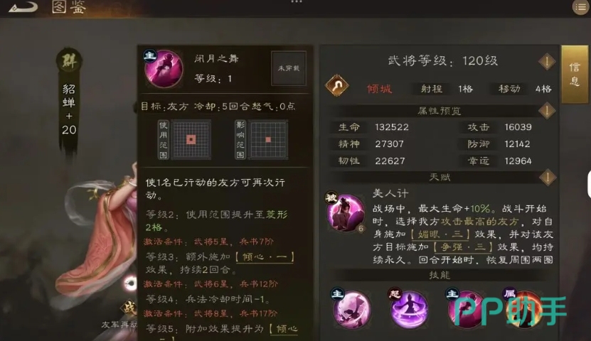 除了诱惑之舞,貂蝉的另一个主技能闭月之舞,在战斗的关键时刻,她能够凭借这一技能,使1名已经行动过的友方再次获得行动的机会,在战棋游戏这种注重回合制策略与行动顺序的玩法体系下,行动回合的把握往往直接决定了一个单位在战斗中的发挥程度和战斗贡献大小,有了貂蝉的闭月之舞技能,友方单位便拥有了更多的可能性和战术选择空间。
