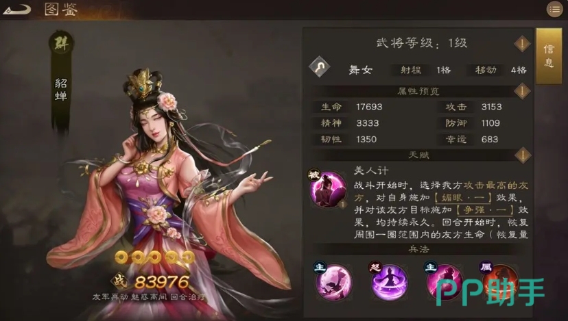此外,貂蝉还拥有属性技能战舞,这一技能为她自身提供了全属性+1.5%的增益效果,虽然从单纯的数值上看,这一增益幅度可能并不十分显眼,但在实际战斗中,这种全方位的属性提升却能够产生意想不到的效果,它能够让貂蝉在其他技能的配合下,发挥出更加出色、更加稳定的战斗作用,目前在游戏中获取貂蝉的主要途径是通过点将台,在第30 天和60天这两个特殊的时间节点,玩家将有机会拿到两个貂蝉本体。