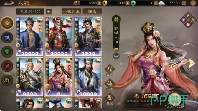 群雄武将中,吕玲绮、李儒、董卓都有一定的培养价值,而在整个游戏中,T0级别的武将当属吕布和貂蝉,吕布的强度其实一点都不比单点技能差,关羽的综合能力接近于T0,单点能力可以算作T1,他非常适合小氪玩家,在12星后实力会提升一个大档次,其他接近T0的武将还有孙尚香、吕玲绮、李儒等。