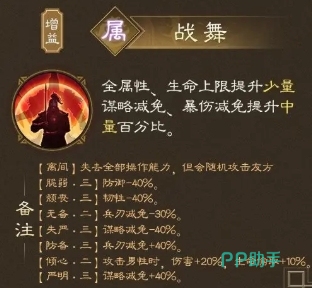 刚烈无畏作为主动技能,跟上面的勇战雪恨相比,它的用法更为丰富多样,当刚烈无畏技能发动时,夏侯惇会对敌人造成大量近战兵刃伤害,攻击之前,敌人身上如果是提前就有缓兵一、缓兵二之类的负面状态,那么此时的夏侯惇输出之前带来的增益就是会个敌人持续施加印记,而且在成功击败目标后,夏侯惇自身带来的除了上面缓兵系列之外,还有防备的效果,这里可以用的是防备一,这个效果能让夏侯惇的兵刃减免达到20%,这一系列的效果组合在一起让夏侯惇的行动更加全面。