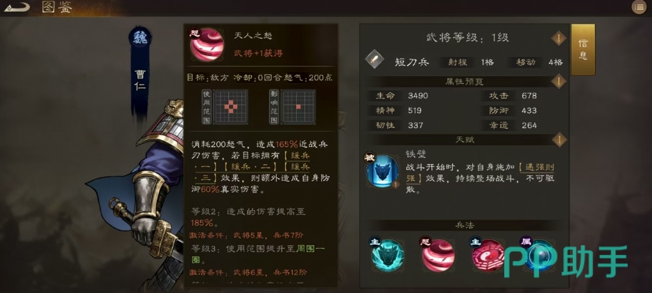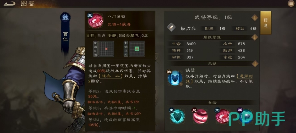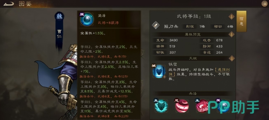 至于武将属性技能坚盾,它能让曹仁的全属性增加1.5%,随着技能等级的提升,带来的增益效果也越发高,等级2时,全属性提升至2%,同时生命上限也会增加2%,激活条件为武将5星和兵书7阶,等级3时,全属性提升至2.5%,生命上限提升至2.5%,并且格挡几率增加7%,此时需要武将6星和兵书12阶才能激活,而等级4时,全属性提升至3%,生命上限提升至3%,格挡几率提升至8.5%,还额外增加了暴伤减免12.5%,全方位强化了曹仁的生存能力和战斗续航能力。