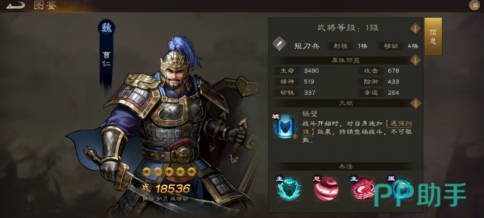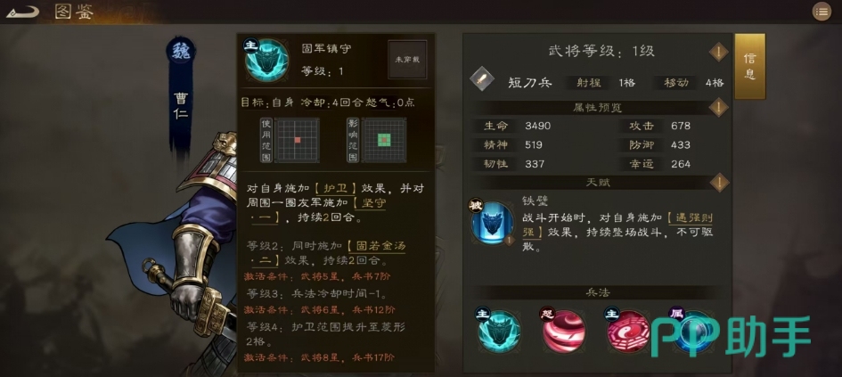曹仁他的天赋铁壁,在战斗一开始,便能对自身施加遇强则强这一强力效果,而且该效果会贯穿整场战斗,关键的一点是它无法被驱散,这就让曹仁面对各种复杂战局时都能有相对稳定的发挥,再来看他的主动技能,首先是固军镇守,此技能一旦发动,能对自身施加护卫效果,同时还会将坚守一效果传递给周围一圈的友军,且这种增益状态能持续2回合之久。