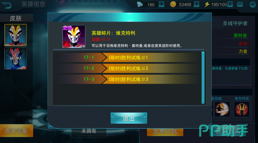 首先我们来看看获得维克特利的方式,是通过打限时的胜利试炼获得英雄碎片从而完成召唤的,英雄碎片需要10个。所以限时的胜利试炼开始的时候大家一定要去抓紧打哦。