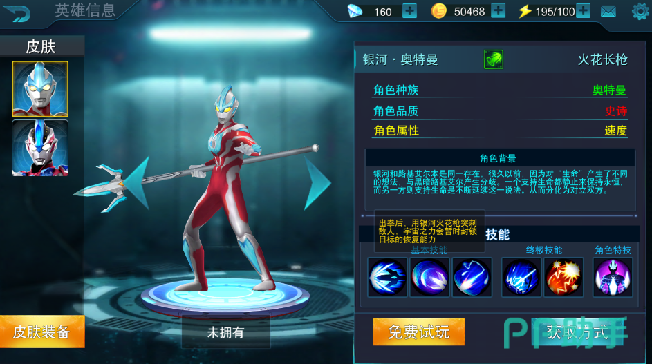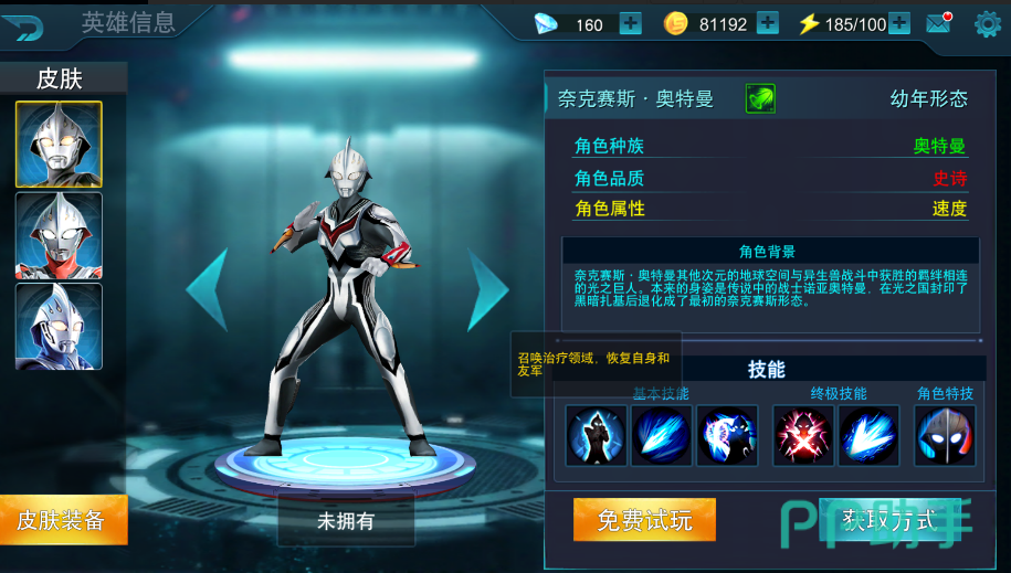 接着我们再给大家分析一下这位英雄的玩法吧,基本技能3个全部属于攻击技能,第一个属于远程伤害,后两个属于近战技能。终极技能中的第一个技能可以召唤银河奥特曼来帮助战斗,这也是这位英雄比较牛逼的技能之一哦。同时特色技能是可以减少敌方的一个闪避效果的。所以这位英雄技能可以这么理解远程打人,近程打人,喊人来打人以及降低对方速度从而更好地打人。