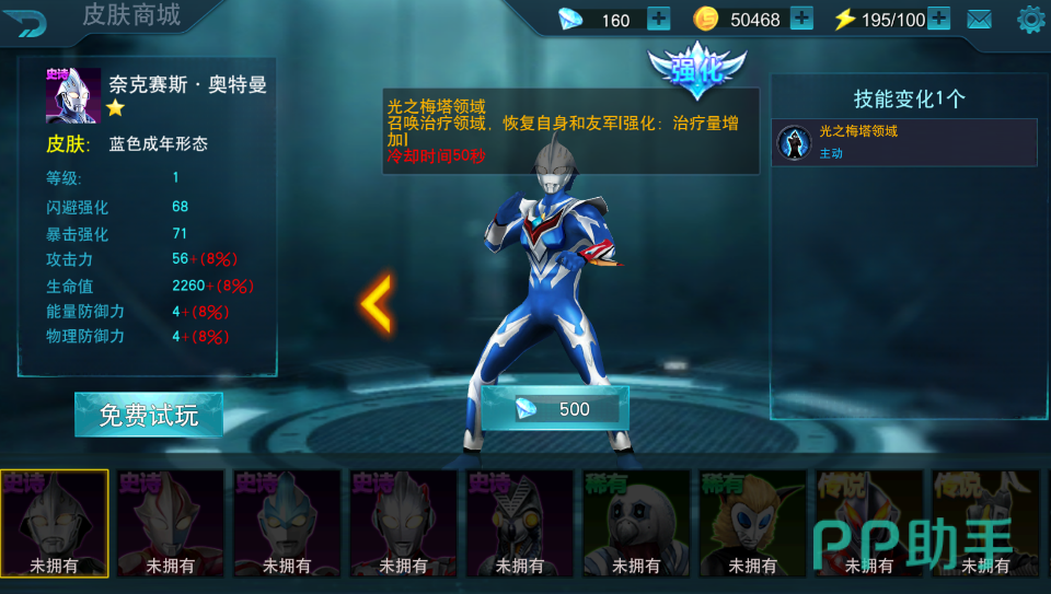 并且这位奥特曼的皮肤强化形态的技能得到了一部分的强化和修改,首先精英级别的皮肤对于这位奥特曼的攻击,生命以及防御属性都增强了百分之10。