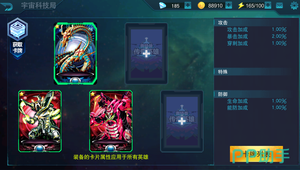 宇宙科技局这个功能给玩家提供一种提升英雄战斗力的方法,在这里,玩家可以通过挑战宇宙监狱中通缉令里的怪兽,从而获得卡牌。获得的卡牌可以进行佩戴,卡牌分品质的高低能够给英雄带来不同的属性加成。并且玩家可以通过升级卡牌的方式,提升卡牌的属性。