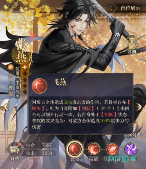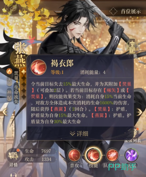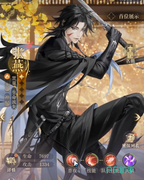 整体来看,张燕不仅是外表帅气的“颜值担当”,更是一名非常强力的火系密探。凭借其出色的技能设计,能够在战斗中担任核心输出角色,尤其是他强大的增伤与多次行动能力,能够帮助队伍迅速建立优势。如果你是火系密探的爱好者,张燕无疑是一个值得期待的强力角色,不仅能在输出上带来巨大的冲击力,还能通过天赋和大招提供团队的生存保障。