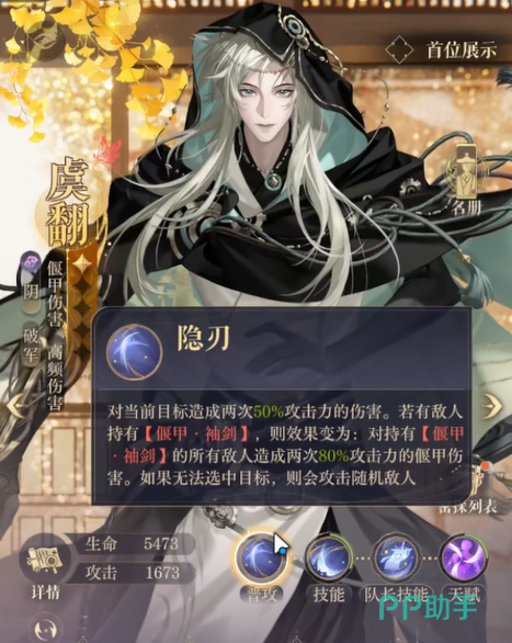 首先来看虞翻的普攻技能“隐刃”。这一技能能够对目标造成两次伤害,并且在敌人身上持有“偃甲·袖剑”效果时,普攻会转化为对所有持有该效果的敌人进行两次偃甲伤害。这意味着,虞翻的普攻不仅具备高频率的伤害输出,还能够通过敌人身上的特殊效果,扩大伤害范围。此外,如果敌人处于无法选中状态,虞翻会随机选择目标进行攻击,这也为他的普攻增添了一定的随机性和灵活性。