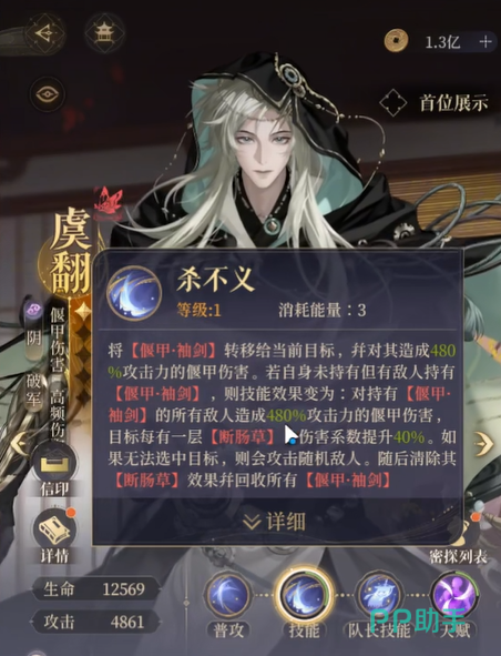 虞翻的核心技能是“杀不义”,该技能可以将“偃甲·袖剑”效果转移到攻击目标身上,并对目标造成偃甲伤害。如果敌人已经持有该效果,虞翻的技能会扩展为对所有持有“偃甲·袖剑”效果的敌人造成伤害。此外,如果敌人身上有“断肠草”效果,技能的伤害会进一步提升。通过这一技能,虞翻不仅能够对敌人进行高效的控制,还能够通过消耗敌人身上的“断肠草”效果,增加自己的输出能力。