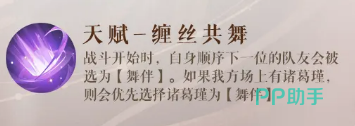 至于天赋“缠丝共舞”,它的作用更像是一种战斗的引导。战斗开始时,诸葛诞会根据场上的队友顺序,选择一位作为舞伴。而有意思的是,如果场上有诸葛瑾,他将优先选择自己哥哥作为舞伴。这一设计,也给诸葛兄弟的组合提供了更多的战术选择,能够迅速提升整体作战效率。