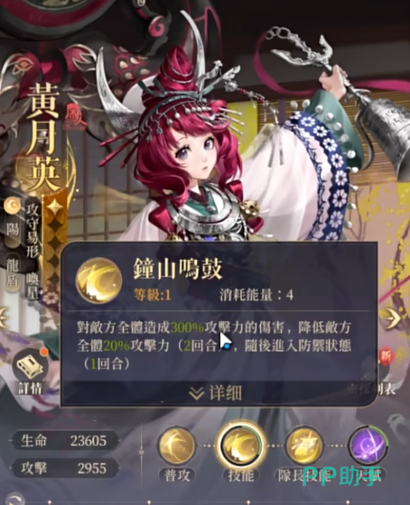在“鼓”形态下,黄月英的普通攻击是“振鼓”,它不仅会对敌人造成伤害,还能让她进入一种防御状态,持续数回合。这一机制非常适合她在战斗中充当一个前排坦克角色,让她在输出的同时也能承受伤害,保护队友。她的队长技“累累如鼓”同样非常强大,在战斗开始时就能让敌方全体的攻击力降低,令敌人输出大幅削弱,为我方提供了一个很好的先手优势。