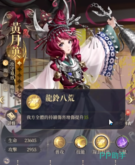至于“铃”形态,它的玩法则有着不同的节奏。在这个形态下,黄月英的队长技能够为队友增加持续伤害增伤效果,让伤害输出更上一层楼。她的大招“赤水击铃”不仅会对敌人造成伤害,还能给敌人附加“归胎”效果,使敌人持续受到伤害。这个持续伤害的效果可以根据黄月英的攻击力不断增强,是她在“铃”形态下的主要输出手段。
