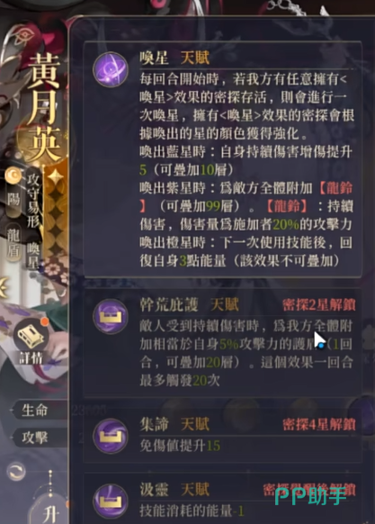 再来看黄月英的天赋“唤星”,每回合开始时,如果我方有存活的“唤星”效果密探,她便会触发唤星效果。蓝星会增加她的最大生命值,紫星则会为她提供一个可以抵挡大量伤害的护盾,橙星则会增强她的技能效果,使她的下一个技能为全体友方添加“固守玉门”状态,让整个队伍的生存能力大大提升。