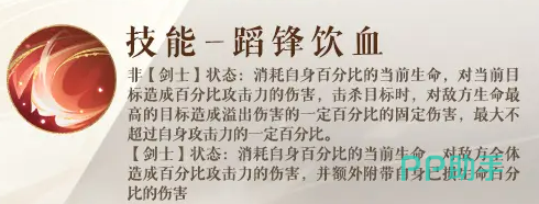说到技能,凌统的【蹈锋饮血】更是将他的战斗风格发挥到了极致。在非【剑士】状态下,凌统会以当前生命为代价,打出强大的攻击力伤害。这个技能最吸引人的地方在于击杀敌人后,还能将伤害溢出到敌方生命最高的目标上,给敌人致命一击。溢出的伤害虽然有限制,但当你一击击杀一名敌人,顺带给敌方最强的那一位补上一刀,这种“横扫千军”的感觉真是爽到爆。而如果他处于【剑士】状态,技能的威力则更上一层楼。不再是单一的攻击,而是全体敌人都得面对凌统的怒火,额外附带的生命损伤简直让敌人无法承受。