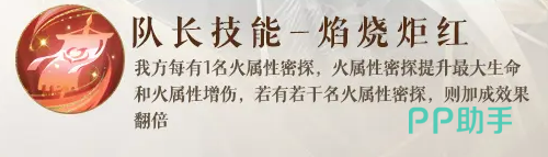 凌统的队长技能——【焰烧炬红】也是极具战术价值的一项能力。在这个技能的加持下,火属性密探们不仅能获得生命和增伤的加成,而且加成效果会因为火属性密探的数量翻倍。这个技能极大提升了火属性密探阵容的战斗力,让你在阵容搭配上拥有更多的选择和策略空间。