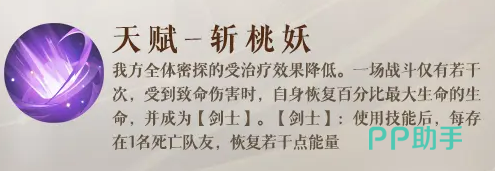 说到天赋,凌统的【斩桃妖】简直是让人眼前一亮的存在。全体密探的受治疗效果降低是个非常有趣的设定,让敌人很难通过治疗手段来扭转局势。最令人惊喜的是,凌统在面临致命伤害时,可以恢复自身最大生命的百分比,并转变为【剑士】状态。这种技能的设计巧妙地弥补了凌统在关键时刻可能遇到的生存问题,并且让他在阵亡队友的数量越多时,恢复的能量越多。这意味着他可以更频繁地使用技能,带领团队走向胜利。