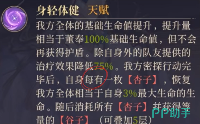 在天赋方面,董奉的“身轻体健”能够提升全体队员的基础生命值,进一步强化队伍的生存能力。同时,董奉的天赋还有一个非常独特的效果:他每当行动结束后,根据自己所持有的“杏子”数量,会为全队恢复相当于自身最大生命值的一定比例的血量。这使得董奉在战斗中能够持续提供稳定的治疗,维持队伍的整体健康状态。