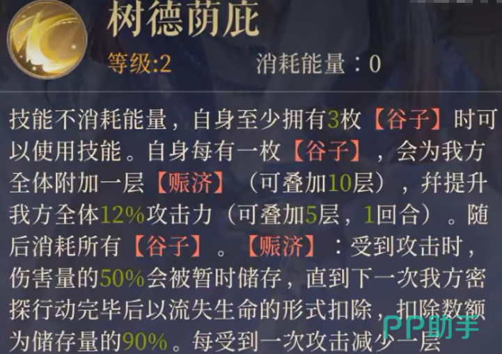 董奉的技能“树德荫庇”是他的一项强大辅助技能,不仅不消耗能量,还能根据自身拥有的“谷子”数量为全队提供攻击力加成,并为全队附加“赈济”状态。值得一提的是,赈济效果会在受到敌方攻击时暂时储存伤害,直到下一次董奉行动时以流失生命的方式扣除。这种技能设计为队伍提供了极大的容错空间,尤其是在面对高爆发伤害的敌人时,能够有效减轻伤害压力,确保队伍的生存。