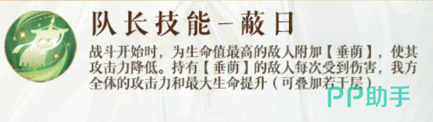队长技能"蔽日"是开场就能感受到的效果。战斗开始时,血量最高的那个敌人会被附上【垂荫】,攻击力直接下降。而且,只要带【垂荫】的敌人受到伤害,我方全队的攻击力和最大生命就会往上涨,还能叠层。所以庞羲当队长的打法很明确,开局集中火力打那个被标记的敌人,边打边叠全队属性,越打越强。