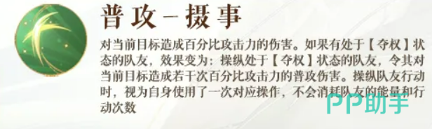 普攻"摄事",分两种情况。队伍里没有【夺权】队友的时候,庞羲自己出手打伤害。但如果有处于【夺权】状态的队友,庞羲就会操纵那个队友,让他对目标打出若干次普攻伤害。操纵的时候算庞羲自己用了一次普攻,不消耗被操纵队友的能量,也不占用他的行动次数。说白了,就是借别人的手打出额外一轮攻击,自己资源没动。