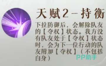天赋"持衡"是维持【夺权】循环的关键。庞羲每次下拉防御之后,当前【夺权】状态的队友会被解除,但下一个行动的队友会重新获得【夺权】。这个循环不断转,只要庞羲保持行动,队伍里基本上一直都有人处于【夺权】状态,不会白白断掉。