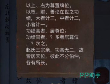 场景五:进来之后能看到一个台面上面放了很多碗,将这些脏器食物。获取一下再根据线索,把刚刚牛头马面残页和门口挽联得出,赏善对应的是公白,罚恶对应的是刚红,察查对应的是直白,阴律对应的是明蓝,在家里面四个人像给排列一下,就会生出一个石台,得到判官令牌,打药鞭和蜘蛛精的残页,然后再按照获得的这几个道具边打蜘蛛腿,再根据这个出的碑文,将墙上激光放入判官令牌,拿到孟婆泪,再把它放到桌子上的木盘里面,拿到记忆残页,再把引魂灵放到盘上,将色子调整成“5221”,点击就可以通过这一章啦。
