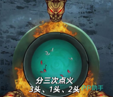 场景四:然后就来到了一个叫做“断妄府”的地方,在这个门口有一个巨大炉鼎顶左右,两边还有两盆火,根据两盆火炉伸出的鬼手来调整中间,炉鼎的底座,就能获得酒杯和元宝了,然后再根据前面获得的牛头马面残页调整门上牛头马面的机关,让牛头的鼻子打开马面的眼睛打开,再将前面获得的酒杯和元宝分别放到牛头,马面的下面门就会打开了。