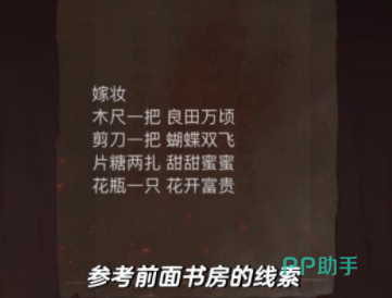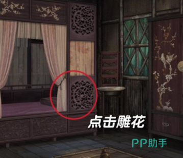 章节开始之后玩玩家需要进入到卧室中,床边的雕花是一项游戏线索,需要统计每个花的数量,然后输入这些数量就可以得到暗格里的八仙谱,在八仙谱的下面还有一句提示,写着贫贱男女万事哀,得到这个线索之后,就可以看看旁边的脸盆有没有线索,玩家通过在脸盆里倒酒,能够找出隐藏的线索,然后根据这些线索可以去书房查看画卷对应的五禽戏和颜色。