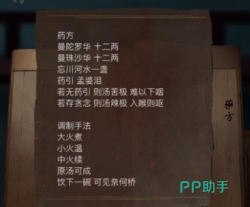 算出来之后就可以去望川河,在这里玩家可以把不忘盏从背包里拿出来,然后用不忘盏去盛舀川水,然后在忘川河周围摘取曼陀罗花和曼珠沙华即可,然后按照药方可以把这些东西放在一起进行调制,大锅旁边的龙头代表着火力的大小,先点三个龙头,再点一个龙头,再点两个龙头,这些步骤正好对应着书籍中的大火煮、小火温、中火续。